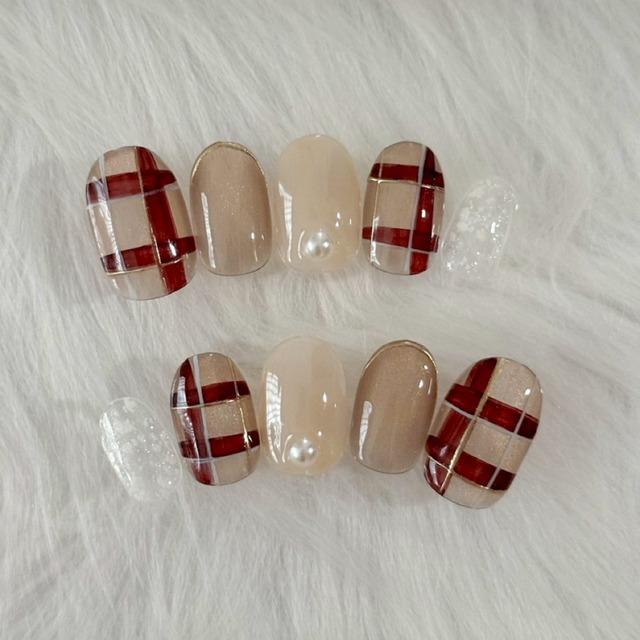 店頭販売でもこの時期人気のチェックネイル オンライン限定でボルドー×ゴールドで大人っぽく高級感たっぷりに仕上げました! 写真はショートオーバルです 12/6から順次発送予定です。 既存のサイズ以外でオーダーされる場合は オプションでその他を選択して 備考欄に番号の記入を必ずお願い致します。 例) 右手01238 左手12329