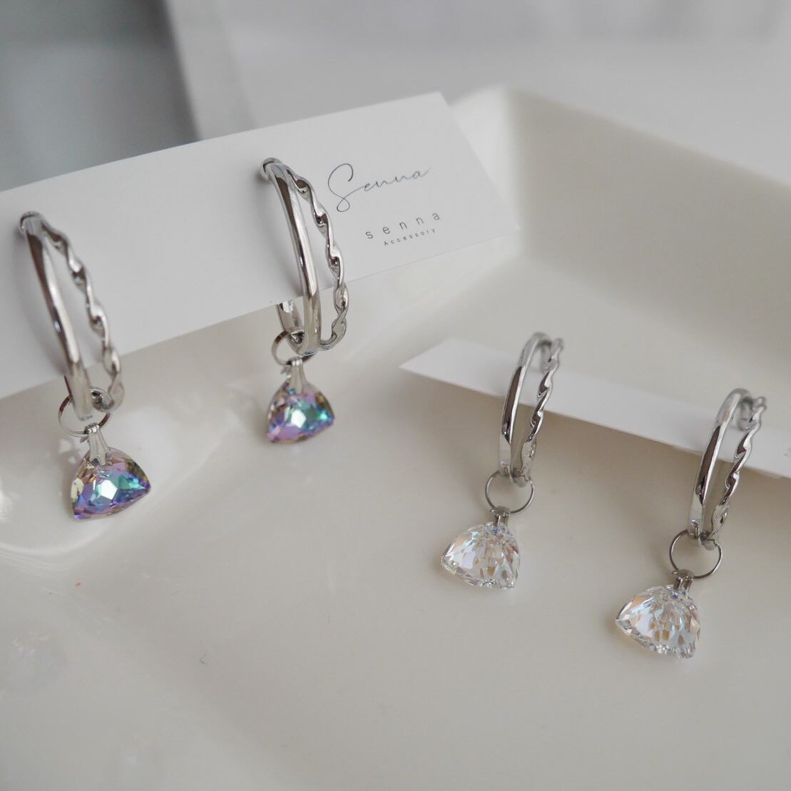 □ Shimmer:透明感のあるクリスタルに、繊細な偏光コーティングを施したカラー。オーロラのような強い虹色ではなく、光をやわらかく取り込みながら、上品にきらめくのが特徴です。