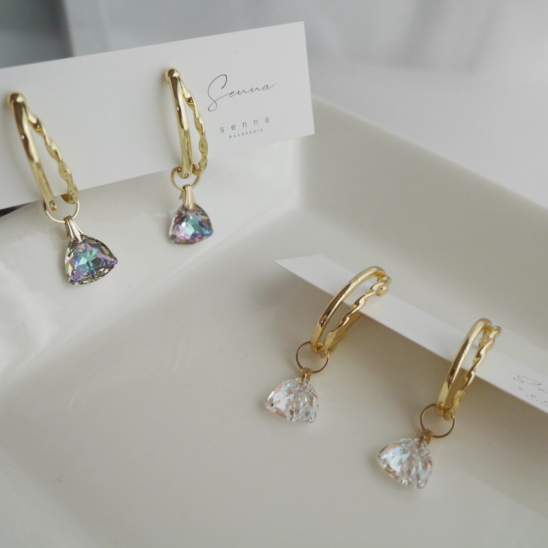 □ Vitrail Light:ピンク・ブルー・パープルを中心とした偏光カラーが特徴のクリスタル。見る角度や光によって色味が繊細に変化し、奥行きのある幻想的な輝きを放ちます。Auroraに比べて落ち着いた印象で、上品に光が揺らぐのが魅力です。大人っぽいデザインや、さりげない華やかさをプラスしたい方におすすめです。