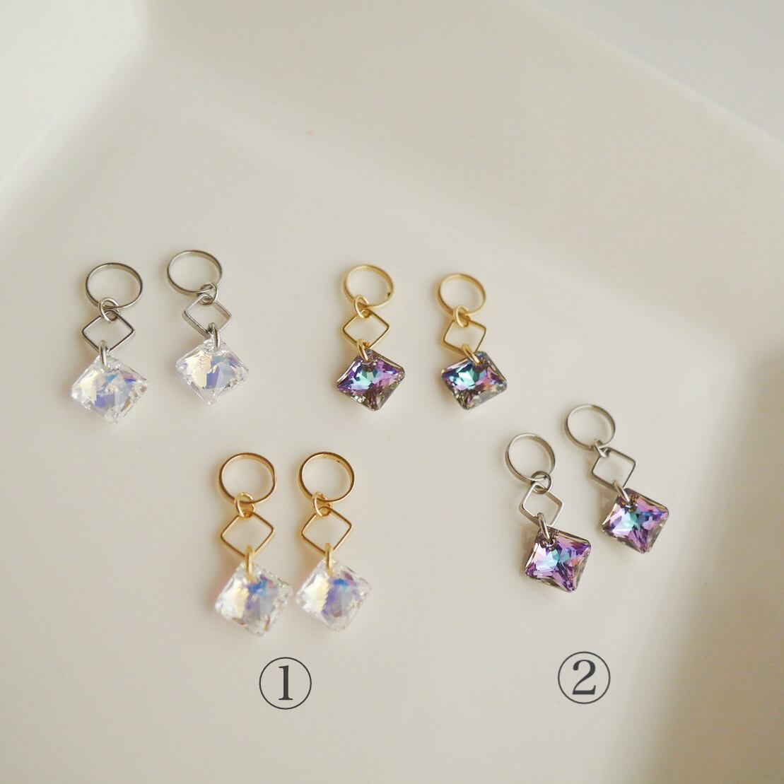 □ ①Aurora:透明クリスタルにオーロラ加工を施した人気カラー。光の角度によってピンク・ブルー・グリーンなど虹色に輝き、華やかで特別感のある印象に。存在感があり、お顔周りを華やかに見せたい方におすすめです。